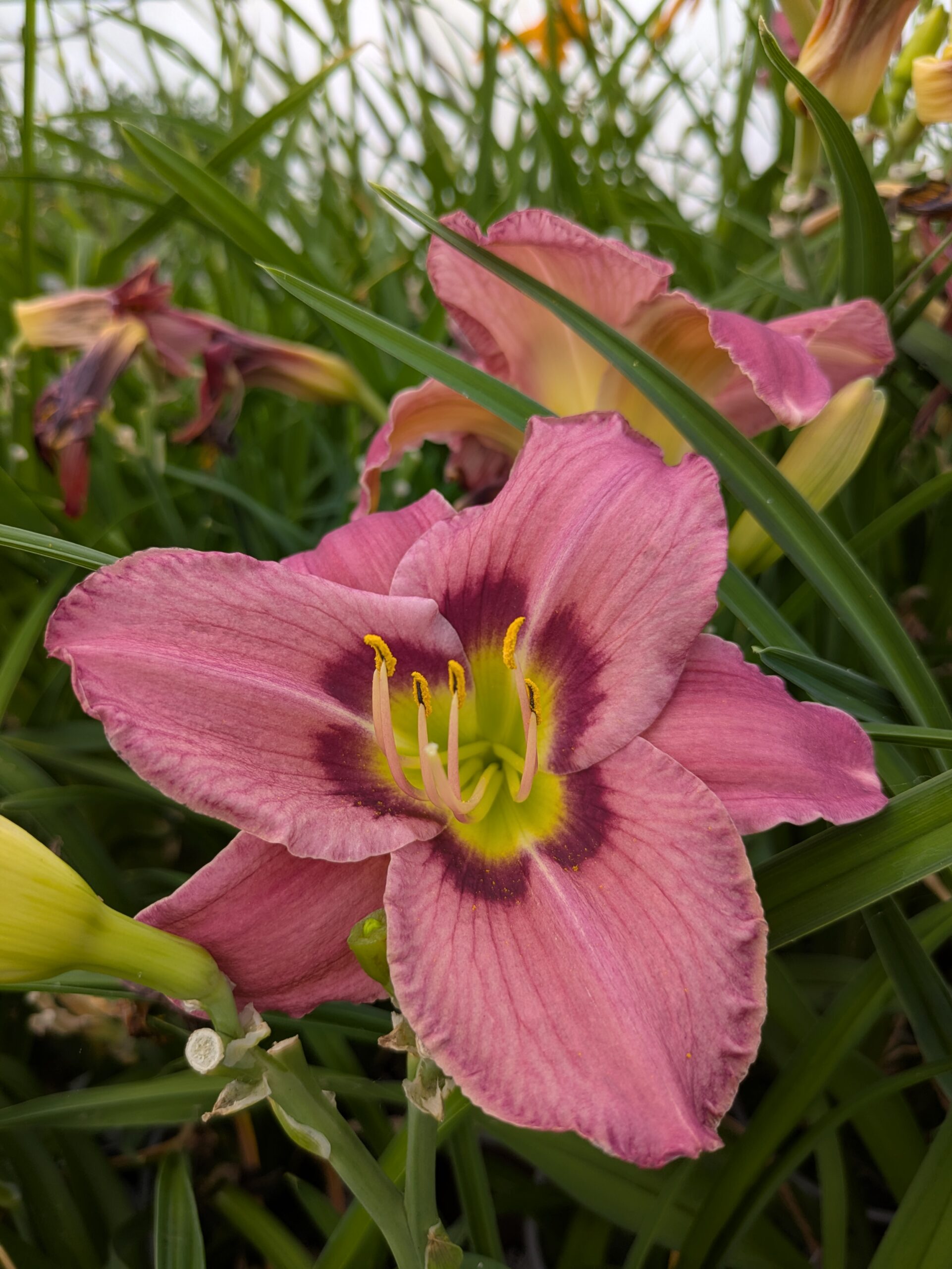 Rosa blomster med mørkelilla ring og grøn midte i juni- august.